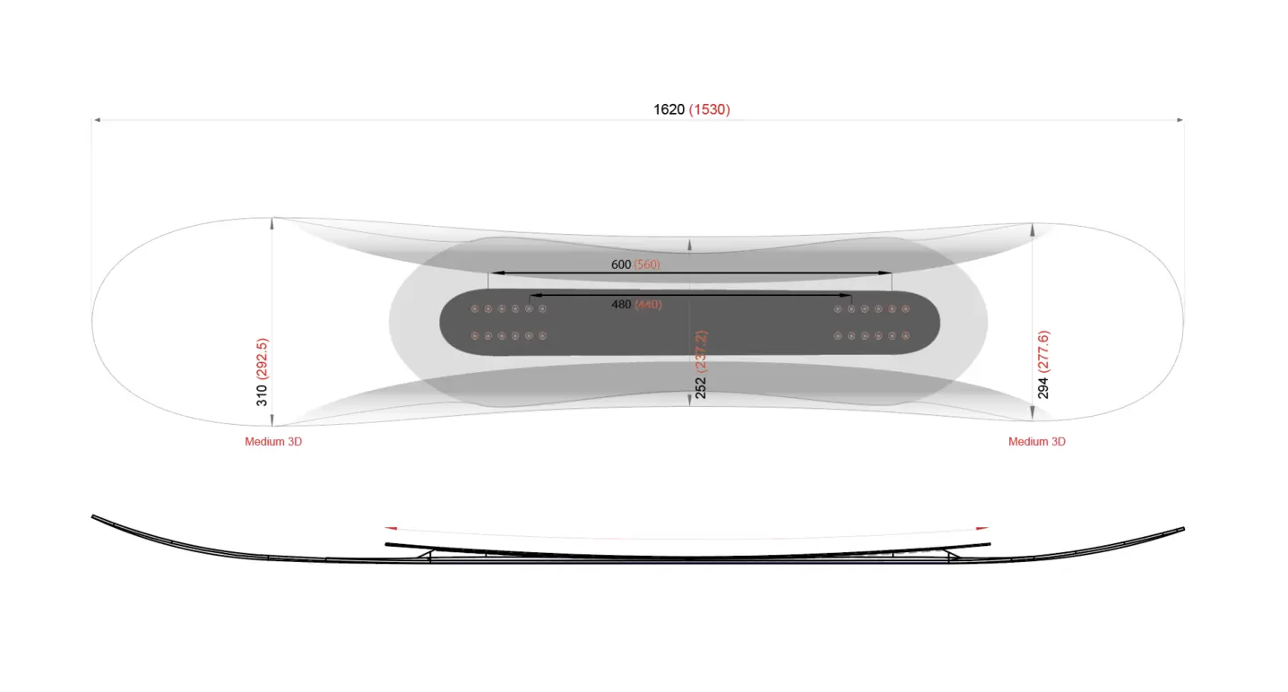 特徴的なウイングプレートを装備したT3は、これまでに比べ繊細なコントロールが可能になります。ビンディングセット位置はボード本体より高い位置にあるため、エッジコントロールはレスポンスが速く、鋭く深いターンに向いています。T3から新たに採用されたMedium 3Dは、これまでの3Dよりも浅く、2.5Dよりも深い形状により、2.5Dのエッジ操作感と3Dの自由度を併せ持つフィーリングにデザインされています。