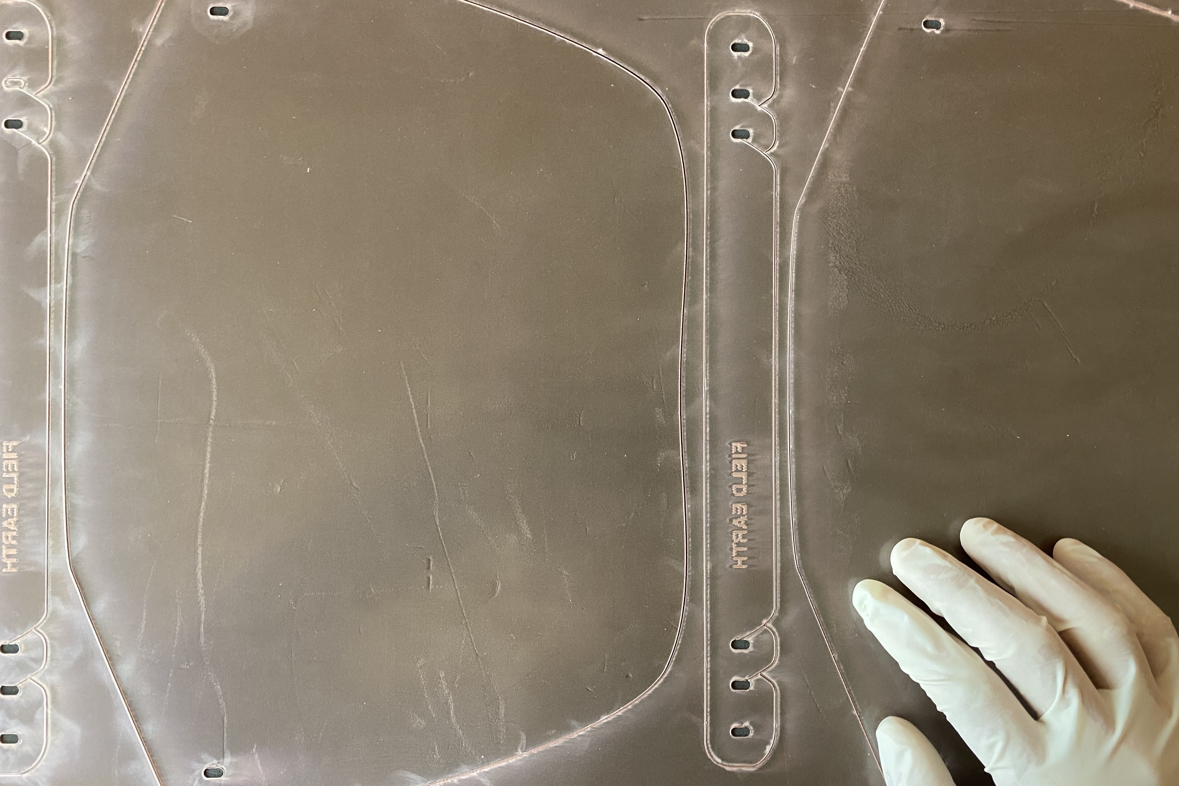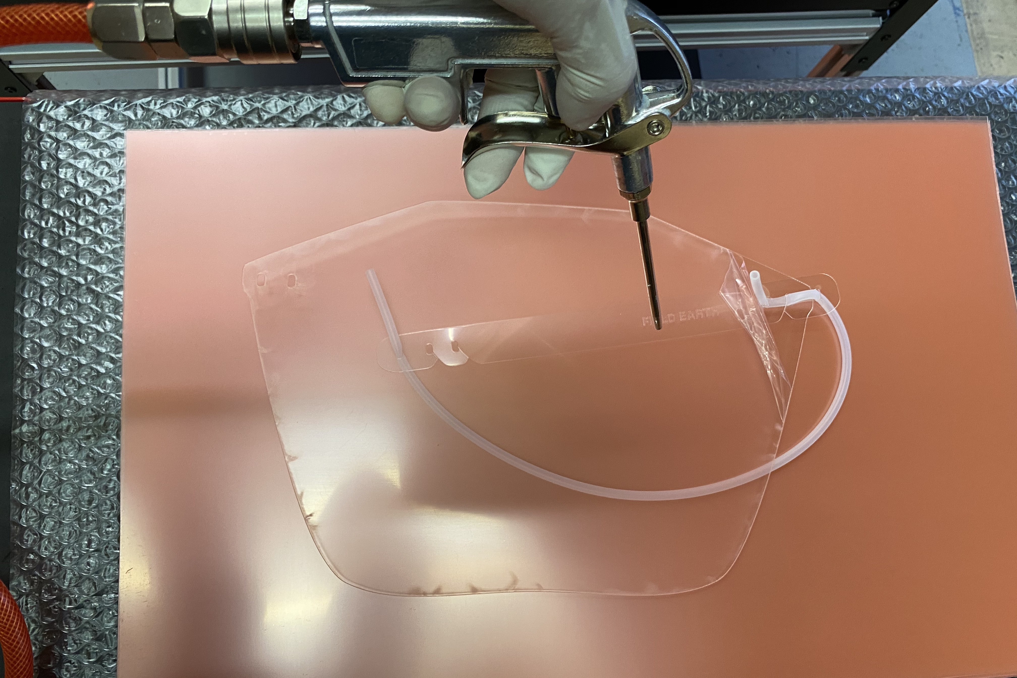 その時点から最適な素材を厳選するとともに試作を繰返しデザイン並びに仕様を決定しました。FIELD EARTHではレーザー加工機がありましたが、フェイスシールドを作る為に必要な高出力のマシーンが無かったことから、敏速な対応が必要な事もあり即日マシーンの購入を決め手配を行いました。また、それと同時に大量に必要な材料を確保する為、専門のサプライヤーへのオーダーを完了しました。